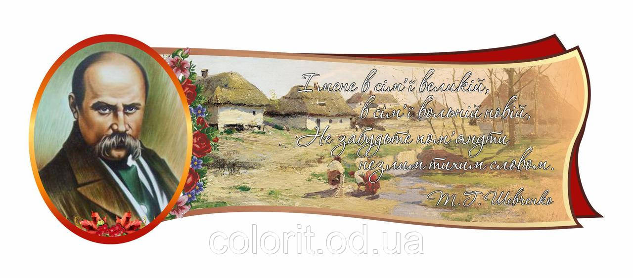 Шкільний стенд "Тарас Шевченко" може бути виготовлений у різних кольорових схемах і з різними розмірами залежно від ваших потреб. Розміри цього стенд для школи — 680х250 мм. Основа виготовлена із пластику ПВХ 3 мм, друкуються зображення у високій якості. Виготовлення на замовлення. Термін виготовлення 3-5 днів. Доставка по всій Україні.