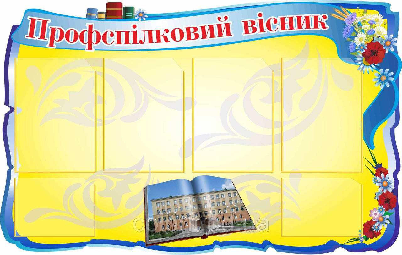 Шкільний стенд "Профспілковий вісник" може бути виготовлений у різних кольорових схемах і з різними розмірами залежно від ваших потреб. Розміри цього стенд для школи - 1100х700 мм. Основа виготовлена із пластику ПВХ 3 мм, друкуються зображення у високій якості. Кишені виготовлені з прозорого пластику: 4 шт. формату А4 вертикальні та 2 шт. формату А5 горизонтальні. Виготовлення на замовлення. Термін виготовлення 3-5 днів. Доставка по всій Україні.