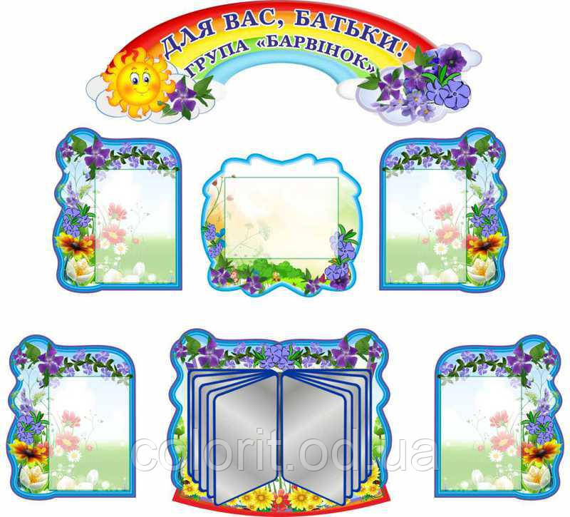 Стенд "Для Вас, батьки" може бути виконаний в різних кольорових схемах і з різними розмірами в залежності від Ваших потреб. Розміри даного стенду для дитячого садка - шапка - 1105х350 мм, центральна частина - 475x400 мм, нижня центральна частина - 630x525 мм, бокова частина (чотири частини однакові за розміром і симетричні) - 365x465 мм. Основа виготовлена з пластику ПВХ 3 мм, друкуються зображення у високій якості. Кармани виготовлені з прозорого пластику: 4 шт формату А4 вертикальні і 1 шт формату А4 горизонтальний. Перекидна система кишень виготовлена з прозорого пластику: 5 шт формату А4 вертикальні - 800 грн.